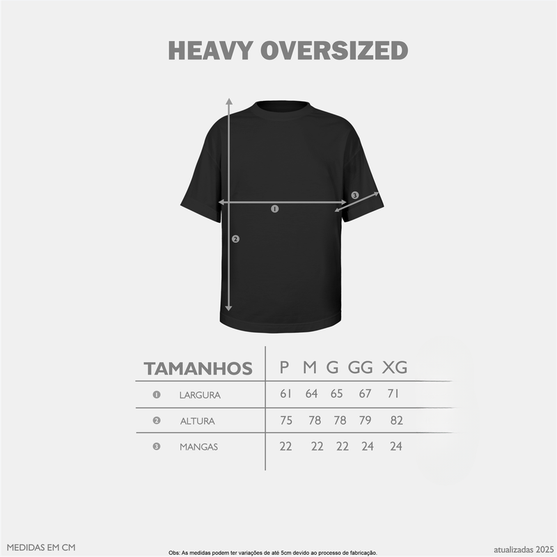 A camiseta Heavy Oversized é uma inovação que nossa indústria trouxe pra quem quer realmente subir o nível de exigência. Conta com nossa modelagem oversized quadrada e passa por um processo de amaciamento e lavagem comfort e estonagem , deixando um toque muito macio e um cheiro instigante. Essa obra divina, conta com uma malha grossa e robusta, proporcionando um caimento sem igual, semelhante as peças importadas de marcas streetwear internacionais. A camiseta Heavy Oversized possui gola 2×1, do jeito que o público ama.